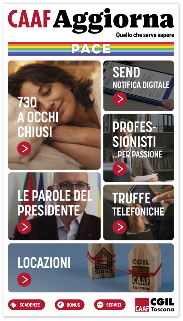 Nasce la nuova pubblicazione digitale CAAF Aggiorna del CAAF CGIL Toscana: uno spazio che raccoglie le principali notizie fiscali in modo interattivo, quadrimestrale e smart.